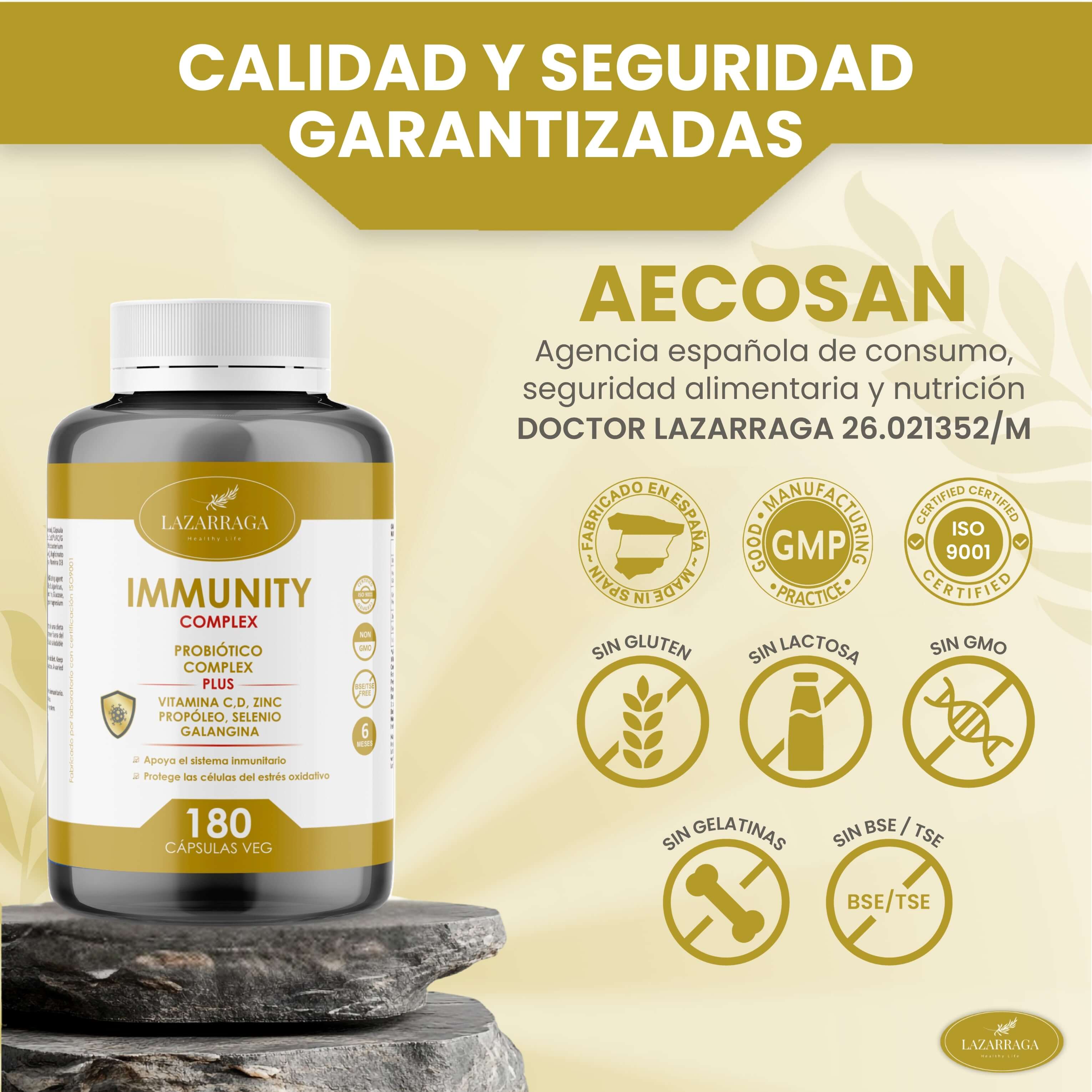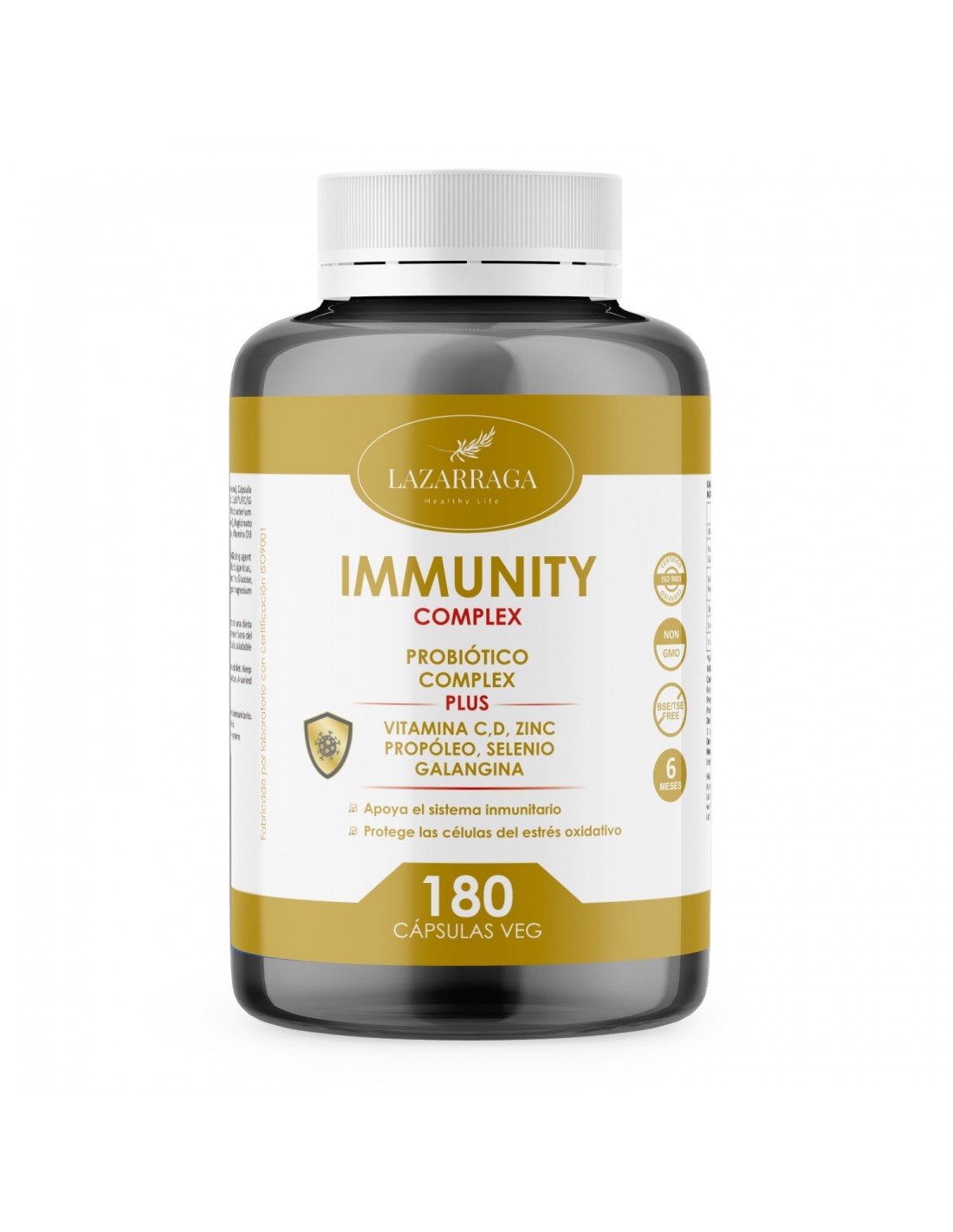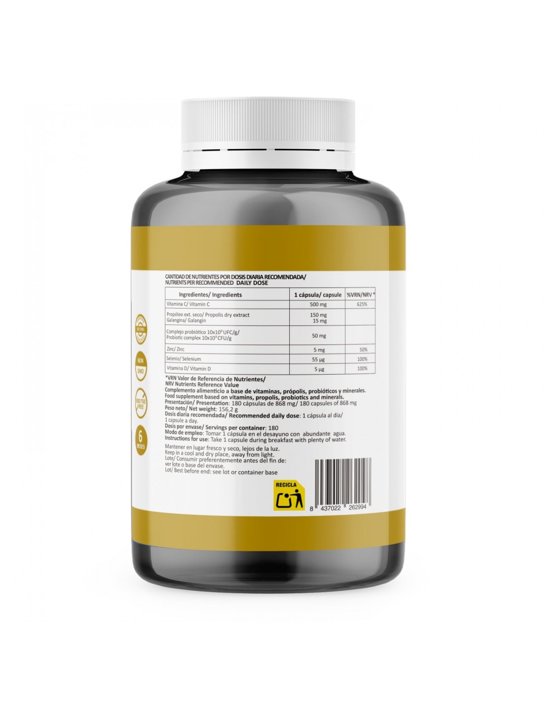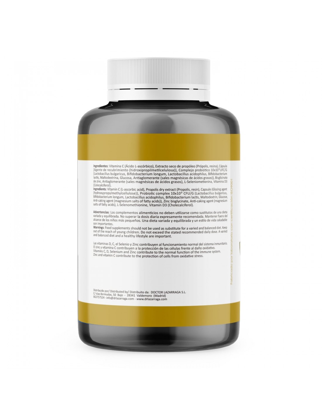 Vitamina C (Ácido L-ascórbico), Extracto seco de propóleo (Própolis, resina), Complejo probiótico 10x109 UFC/G [oligofructosa, Lactobacillus acidophilus, Bifidobacterium bifidum, Bifidobacterium longum y Bifidobacterium lactis], Bisglicinato de zinc, L-Seleniometionina, Vitamina D3 (Colecalciferol). Cápsula (Agente de recubrimiento (hidroxipropilmetilcelulosa)), [maltodextrina, agente de carga (celulosa microcristalina), antiaglomerantes (sales magnésicas de ácidos grasos, dióxido de silicio).