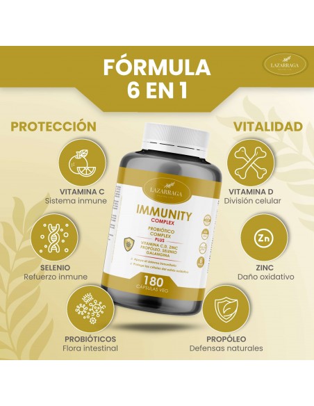 Immunity Defensas Complex 6 en 1 es un complemento alimenticio avanzado diseñado para ofrecer un soporte integral al sistema inmunitario, especialmente en momentos en los que el organismo necesita un refuerzo adicional. Su fórmula combina vitaminas esenciales, minerales clave, probióticos y prebióticos, creando un enfoque completo que actúa tanto en la respuesta inmunitaria directa como en el equilibrio intestinal, uno de los pilares fundamentales de la salud general.