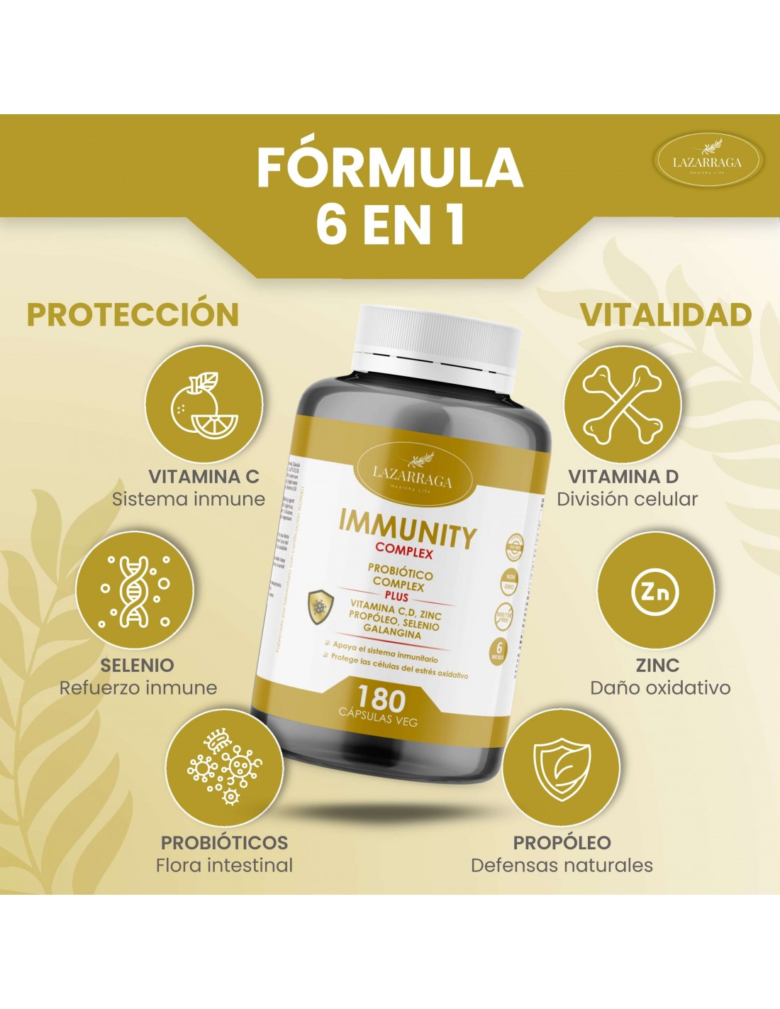 Este complejo está formulado para ayudar al cuerpo a mantener un nivel óptimo de defensas durante todo el año, contribuyendo a una mejor resistencia frente a factores externos, cambios estacionales, situaciones de estrés o cansancio acumulado. Su combinación 6 en 1 permite sustituir múltiples suplementos independientes, facilitando la toma diaria y optimizando la eficacia general.